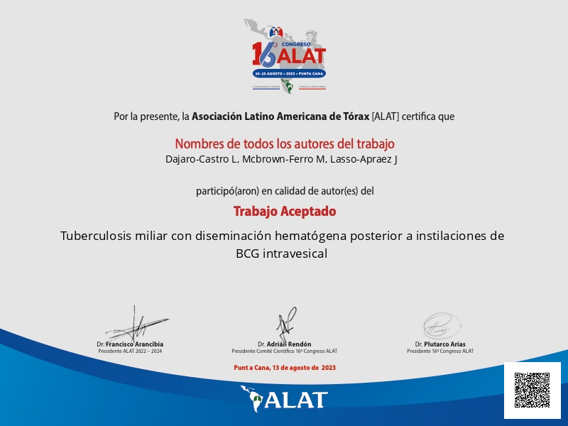 Título: Tuberculosis miliar con diseminación hematógena posterior a instilaciones de BCG...