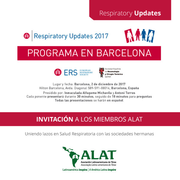 «La European Respiratory Society (ERS) ofrece una oportunidad única, accesible y asequible para ponerse al día y estar a la vanguardia de la medicina respiratoria. El evento, organizado por la ERS en colaboración con SEPAR, se celebrará en Barcelona el próximo 2 de diciembre. Las intervenciones serán en español. Puedes participar, en persona o de modo virtual, desde tan sólo 99 € en este acto. Se impartirán ocho actualizaciones clínicas completas por parte de expertos en cinco campos clave: la EPOC, el asma, el cáncer de pulmón, la enfermedad pulmonar intersticial (EPID) y las enfermedades infecciosas. Obtén más información sobre las Respiratory Updates de la ERS: http://bit.ly/2k2cRoN»