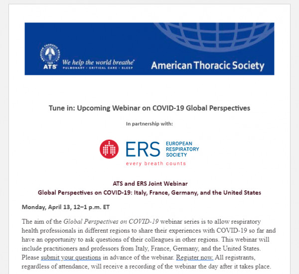 The aim of the Global Perspectives on COVID-19 webinar series is to allow respiratory health professionals in different regions to share their experiences with COVID-19 so far and have an opportunity to ask questions of their colleagues in other regions. This webinar will include practitioners and professors from Italy, France, Germany, and the United States. Please submit your questions in advance of the webinar. Register now. All registrants, regardless of attendance, will receive a recording of the webinar the day after it takes place.