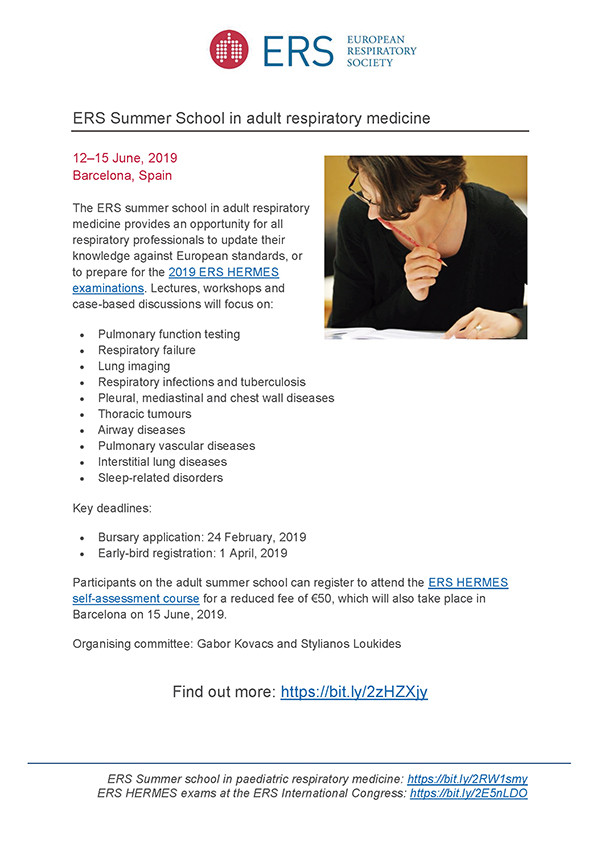 The ERS summer school in adult respiratory medicine provides an opportunity for all respiratory professionals to update their knowledge against European standards, or to prepare for the 2019 ERS HERMES examinations. Lectures, workshops and case-based discussions will focus on: